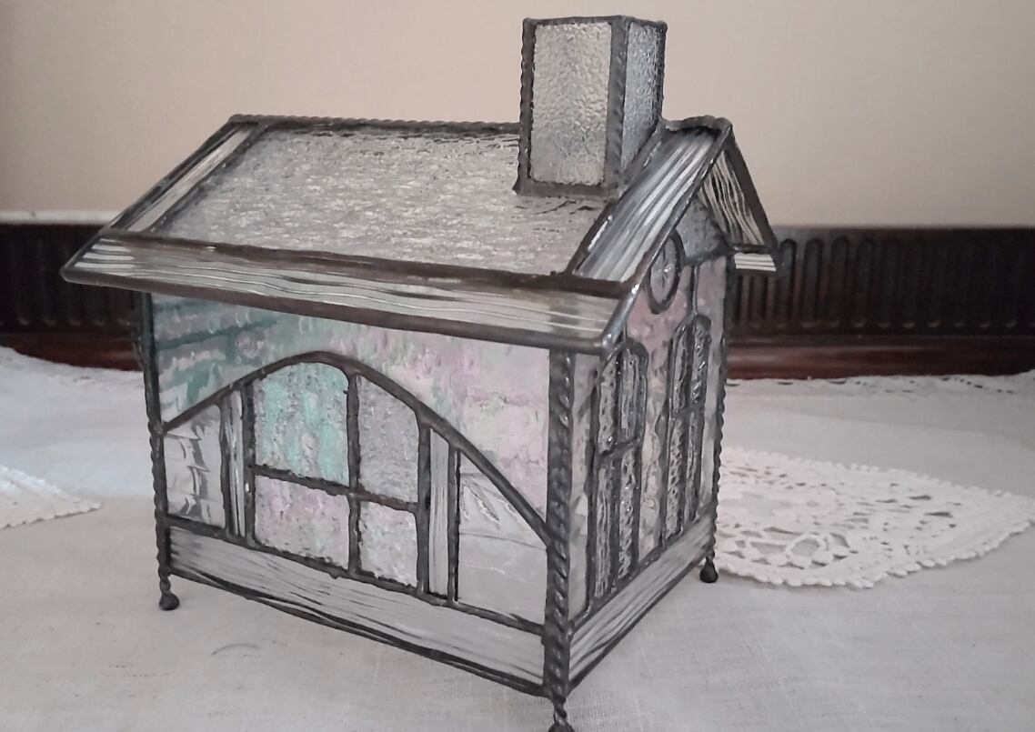 透明とオーロラに光るガラスでできたお家型のオブジェ。